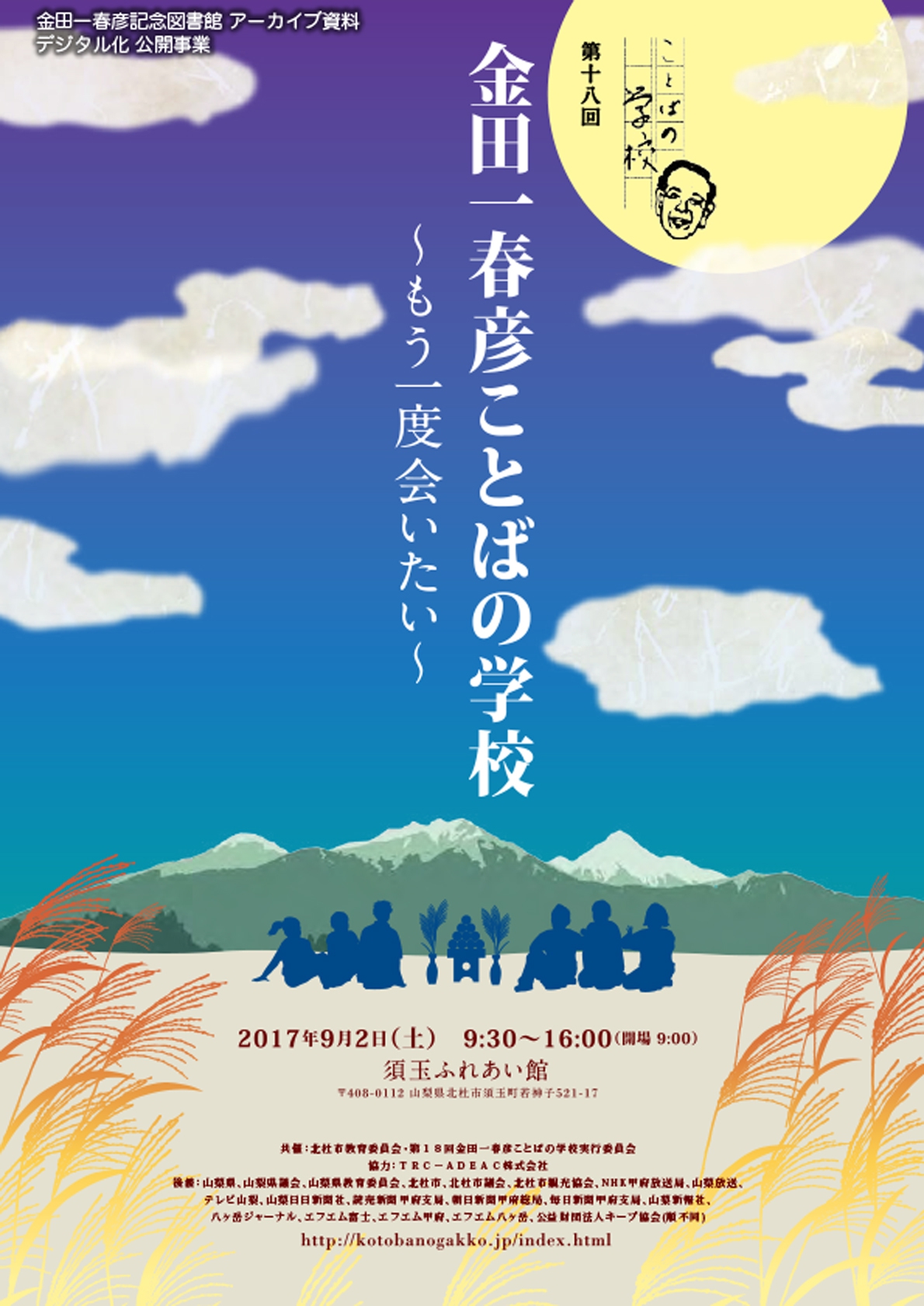 第十八回 ことばの学校 「もう一度会いたい」 日時 平成29年9月2日(土)会場: 須玉ふれあい館(山梨県北杜市須玉町) 方言川柳入賞者受付の様子 開校式で挨拶に立つ金田一真澄校長 開校式で挨拶する渡辺英子北杜市長 方言川柳入賞者表彰の様子(子どもの部) 方言川柳入賞者表彰の様子(大人の部) 2校時の「投句トーク」では、当日発表した題「水」の方言川柳を募集。会場から約120句の応募があり、その場で審査した 「投句トーク」で選ばれた作品を紹介する 3校時では、懐かしい映像を紹介 しながら、金田一春彦氏を紹介 金田一春彦作曲集の中から「白いボート」を披露する 須玉コール・フルールが会場に広がり、映像で金田一春彦氏が歌う「十五夜お月さん」を来場者と合唱する 4校時は、金田一家の謎と題し、祖父の金田一京助氏がアイヌ語研究を行ったのかを映像で紹介 姉弟3人による祖父や父親の想い出話 閉会式で挨拶する谷戸直子実行委員長 金田一春彦ことばの学校恒例の金田一秀穂氏によるサイン会 開催内容 (パンフレット)画像はクリックで拡大します。 全ページ一括表示はこちら(PDFファイル)