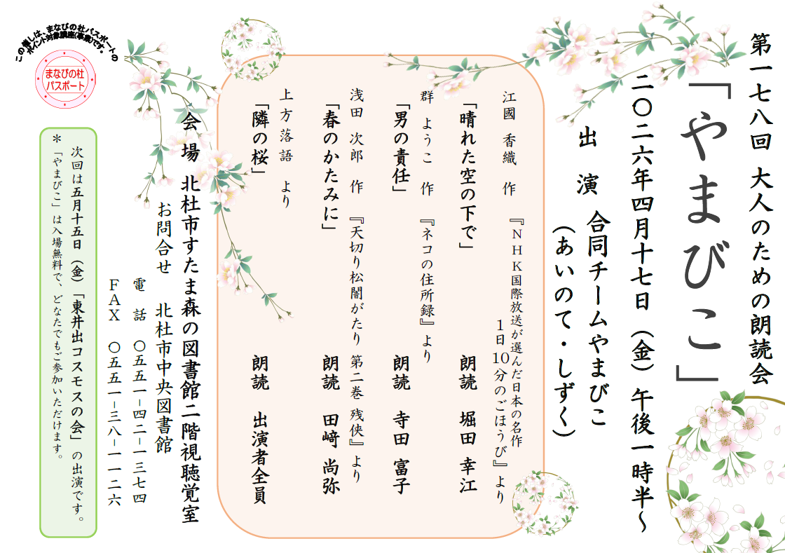 大人のための朗読会「やまびこ」は、北杜市内で活動している朗読グループが毎月第3金曜日に交代で行っている朗読会です。