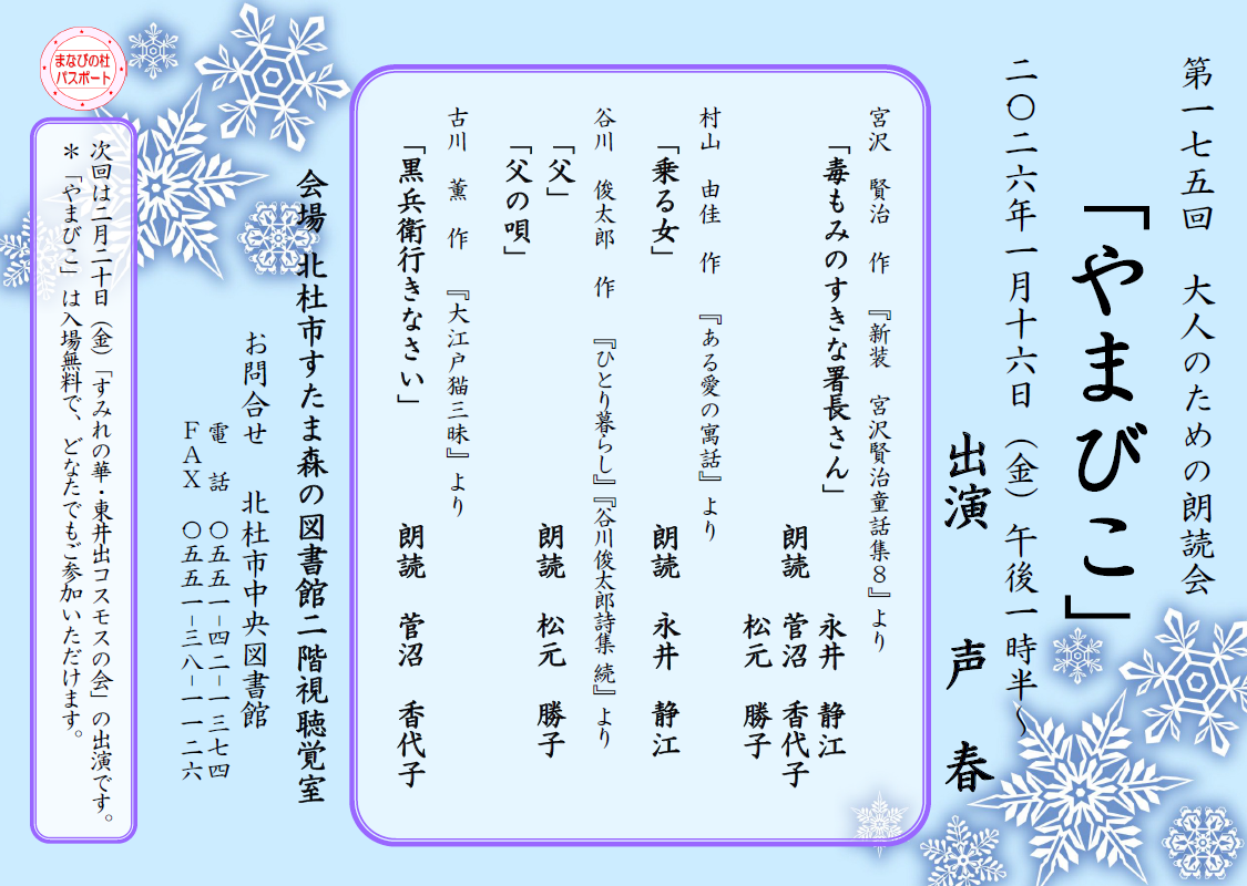 大人のための朗読会「やまびこ」は、北杜市内で活動している朗読グループが毎月第3金曜日に交代で行っている朗読会です。次回の出演は、「声春」です。事前申し込みは不要です。皆様のご来場をお待ちしています。