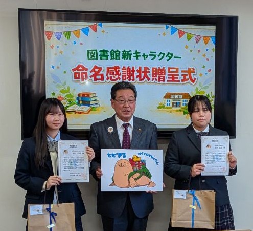 北杜市図書館新キャラクター名前総選挙には、たくさんの投票をいただきありがとうございました!総選挙の結果、最多得票を得た「とどまる」に決定しました。2月12日(木)には、北杜市役所で「命名感謝状贈呈式」が行われ、名前をつけてくれた9人の高校生を代表して出席してくれた、北杜高校1年の中村莉緒さんと帝京第三高校2年の名取杏奈さんに、大柴市長から感謝状と記念品が贈呈されました。
