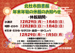 北杜市図書館をいつもご利用いただき、誠にありがとうございます。北杜市図書館(全8館)は以下の日程で休館となります。