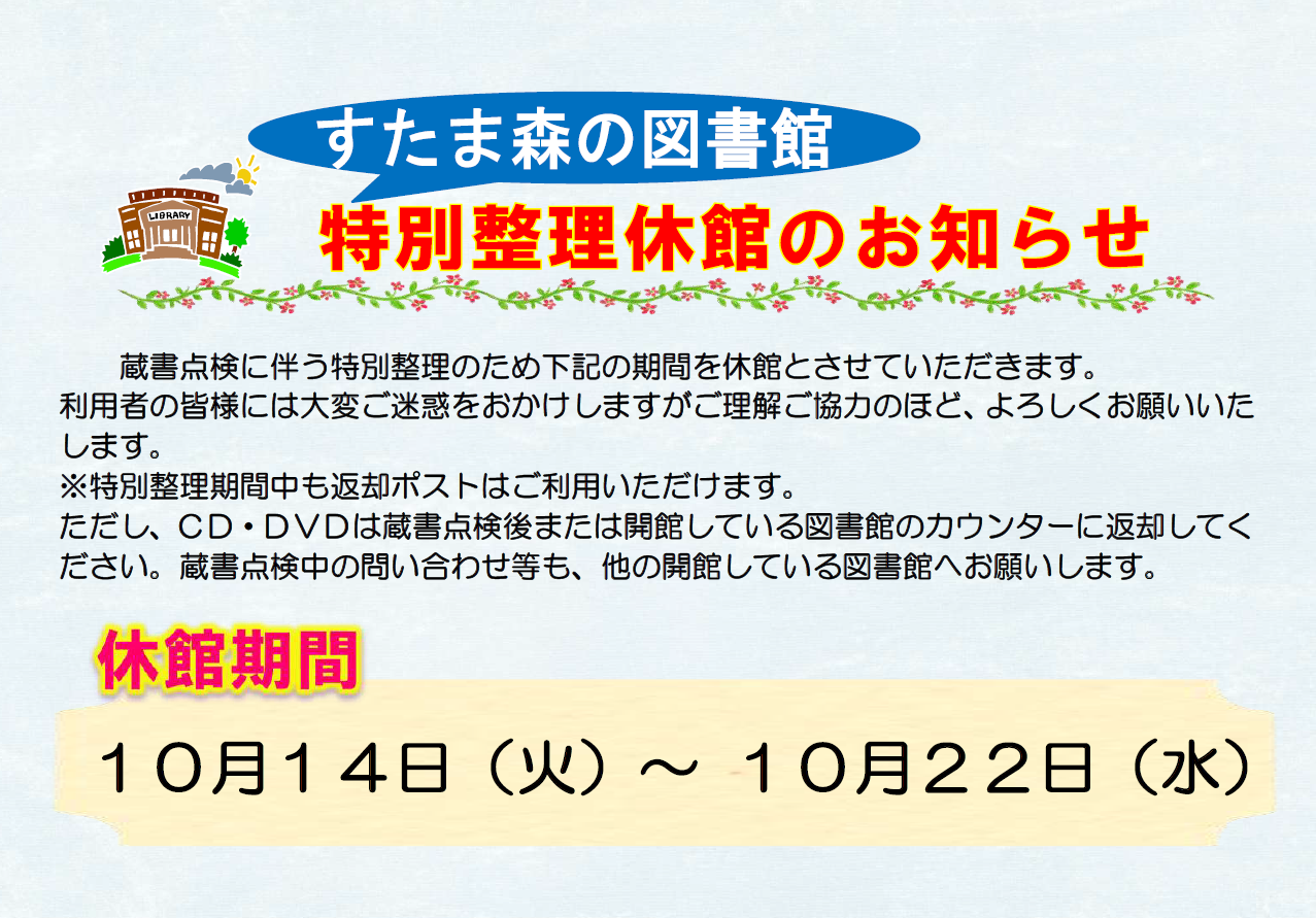 すたま森の図書館では蔵書点検を行うため下記のとおり休館いたします。ご迷惑をおかけしますが、ご理解とご協力をお願いいたします。